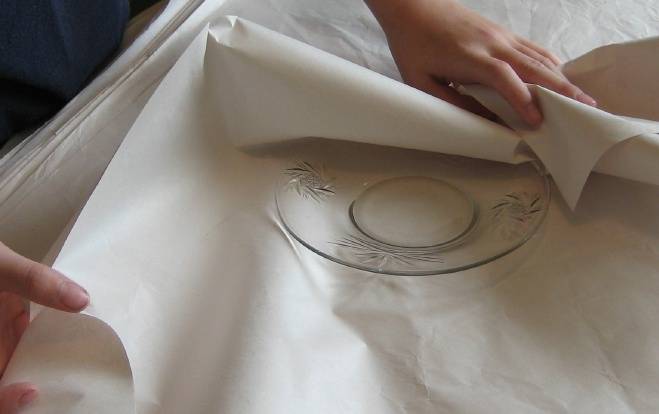 - For plates take a single plate and wrap it with butchers papers. Place the wrapped package atop the stack of papers. You may now add a similar sized plate on top of the wrapped package and take a sheet of butchers paper and wrap the two together. Continue stacking plates up to a maximum of 5 per bundle, then secure with tape. Place these in an upright position inside the box.